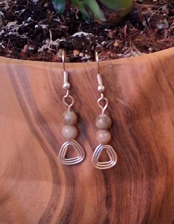 Handmade using silver-plated craft wire, featuring two natural unakite beads per earring and a sleek triangular accent. The earthy green and pink tones of the unakite complement the clean, modern design, creating a versatile piece that blends rustic charm with contemporary style. With a 5cm total drop, they hang beautifully for subtle impact.
